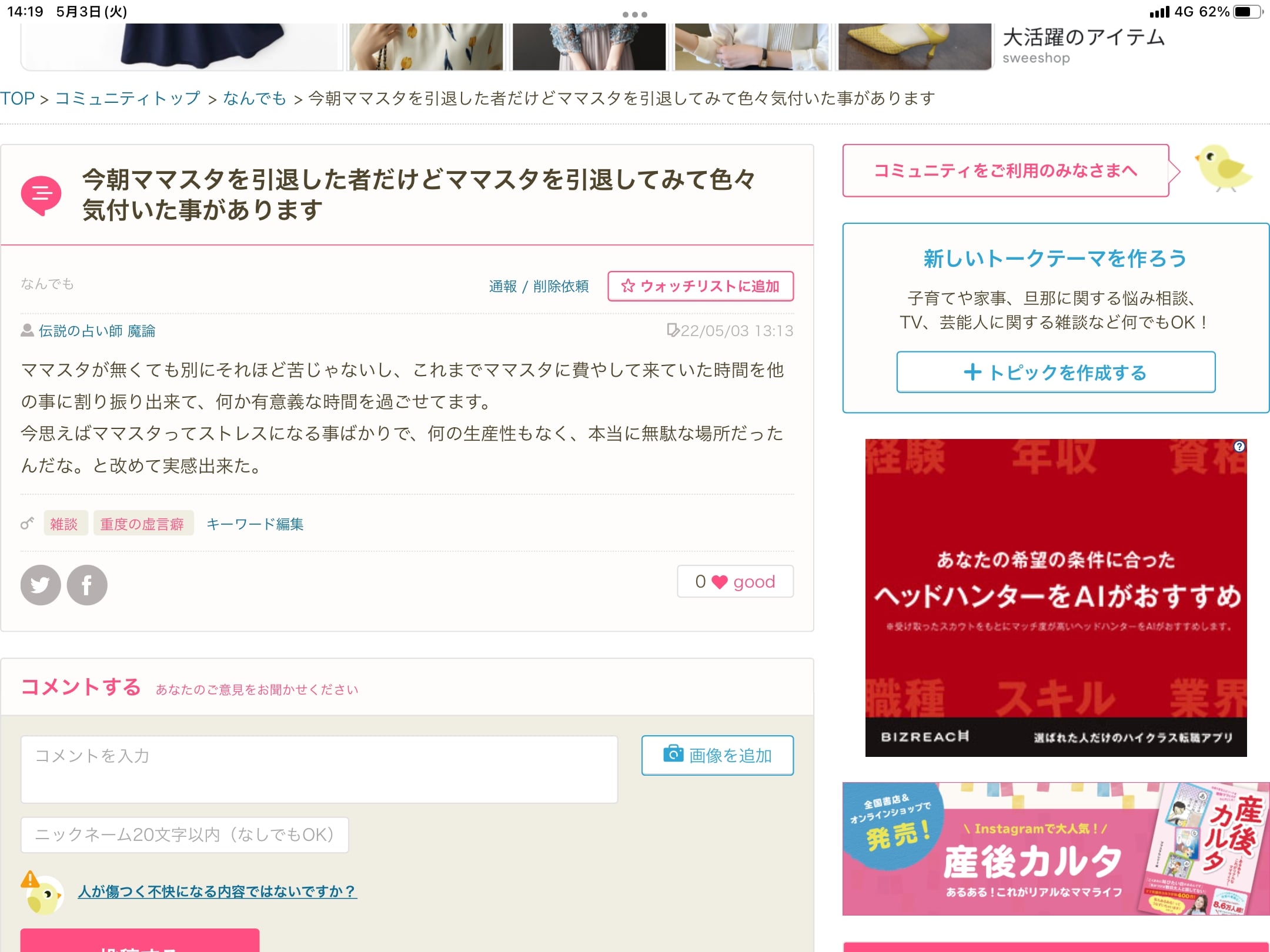 子育てや家事、旦那に関する悩み相談、TV、芸能人に関する雑談など何でもOK!